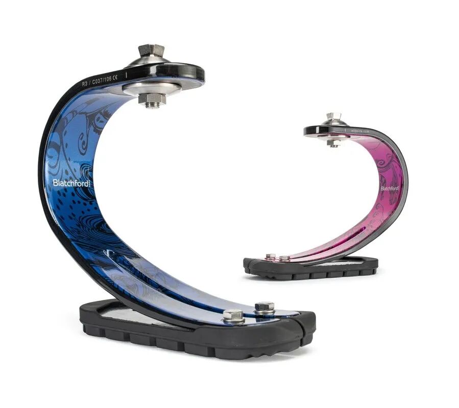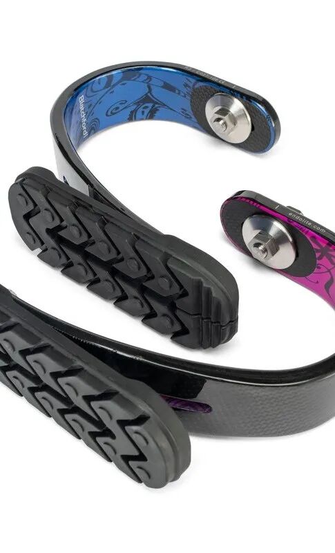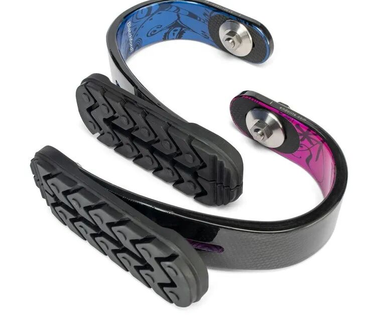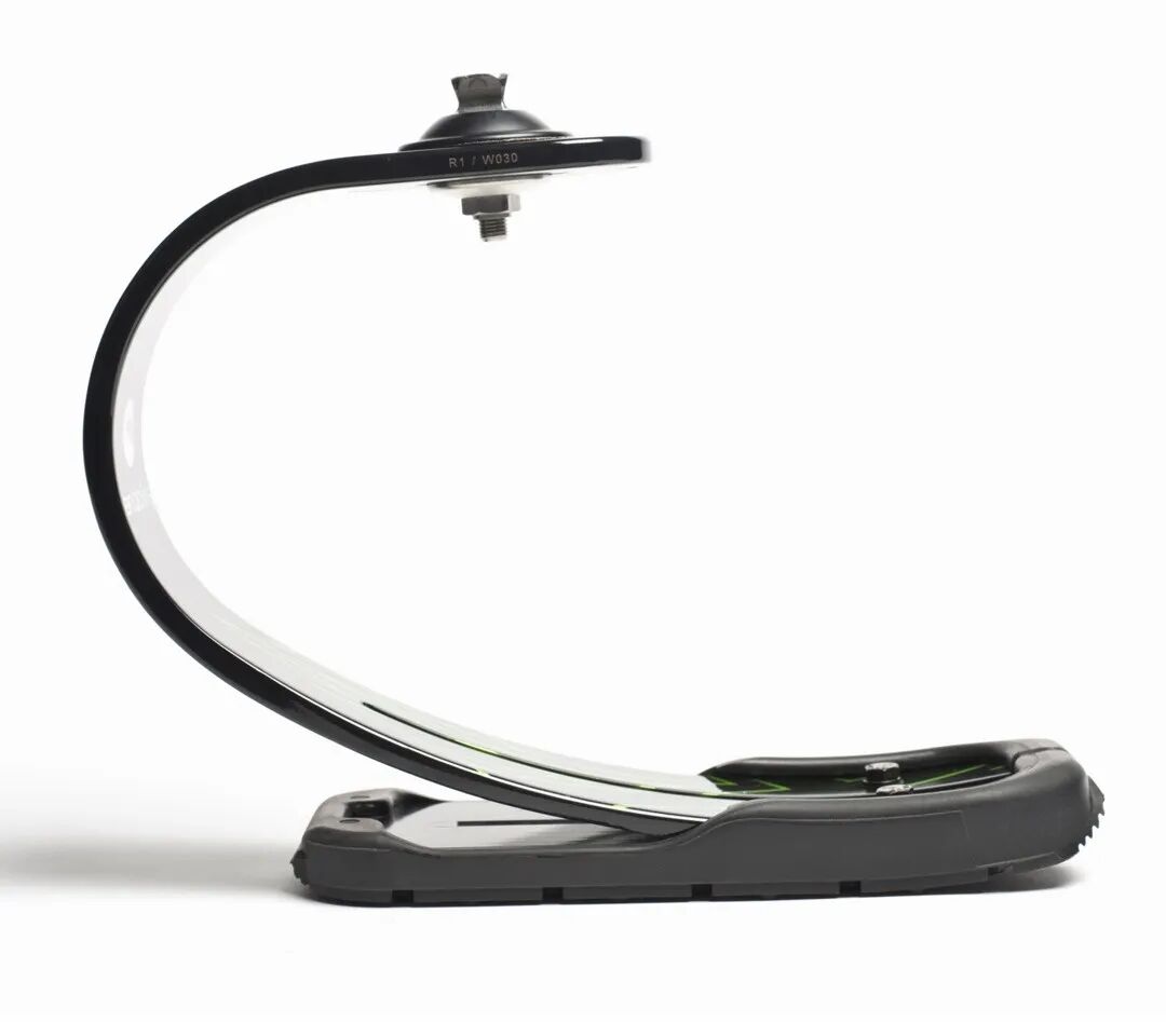 可适应各种弹片硬度的后跟缓冲块。后跟硬度、缓冲减震均可调节。脚板弹片范围:1-9级